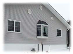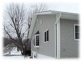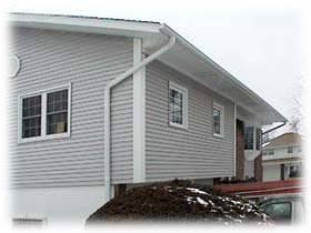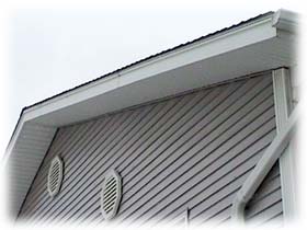 DOWNSPOUT. COLONIAL POST AND DOUBLE-4 VINYL SIDING. SOFFITTS SHOW SOLID AND VENTED PANEL |